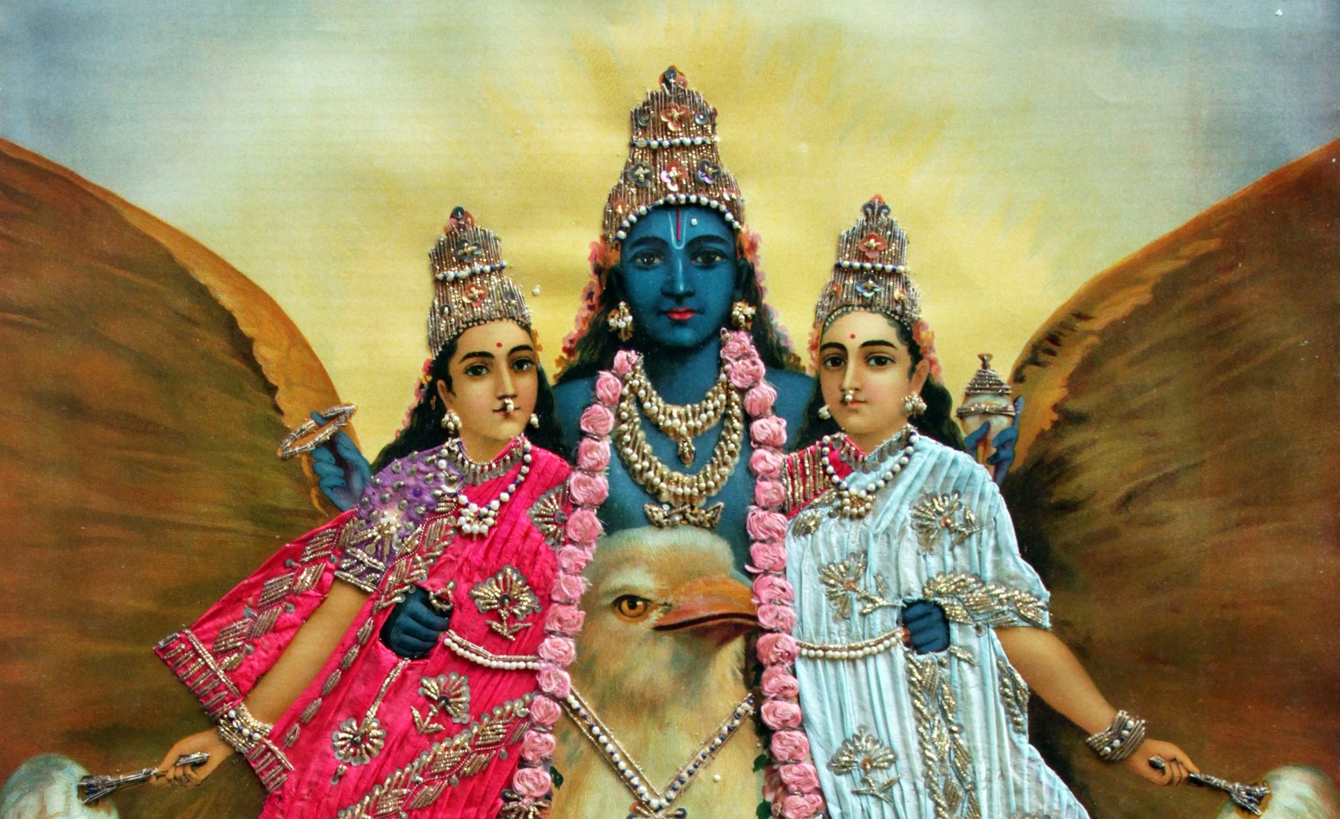Raja Ravi Varma, India 1848–1906 / Ravi Varma Press, Karla-Lonavla, India / Vishnu-Garud Wahan (detail), printed 1894–1930 / Oleograph with Zardosi embroidery / 71.12 x 50.8cm / Purchased 2024 with funds from the Henry and Amanda Bartlett Trust through the QAGOMA Foundation / Collection: Queensland Art Gallery | Gallery of Modern Art / View full image