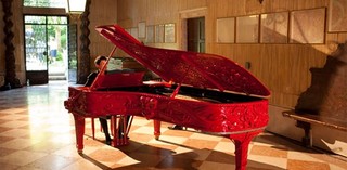 On loan to the exhibition from the Museum of New Zealand Te Papa Tongarewa, Parekowhai’s He Kōrero Pūrākau mo Te Awanui o Te Motu: story of a New Zealand river 2011, is an elaborately carved, fully functional, red Steinway concert grand piano.