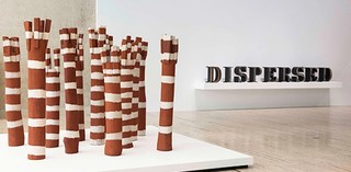 Highlights of the installation include an impressive group of Thap Yongk (law poles) 2002-03 by Kugu (West Cape York) artist Joe Ngallametta; DISPERSED 2008, a text-based installation in laminated wood, cast aluminum and .303 inch calibre bullets by Badtjala (Fraser Island) artist Fiona Foley, and Up in the Heavens the Gods contemplate their next move 2011, by Cairns based Kala Lagaw Yu (Torres Strait) artist Brian Robinson, which is suspended from the gallery ceiling.